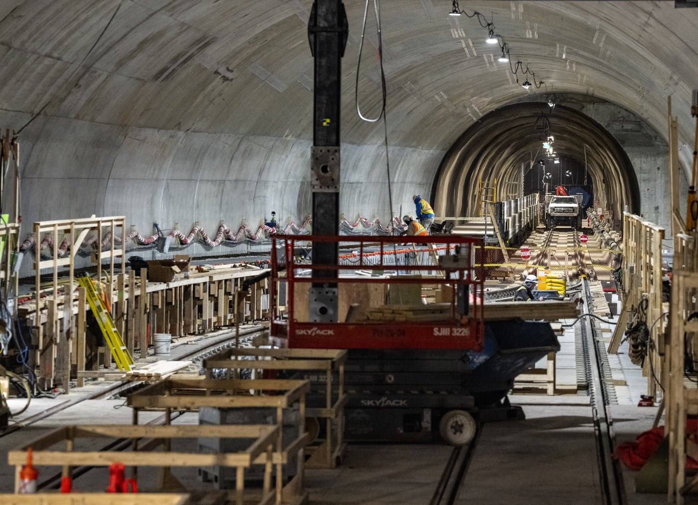 M. Bouffard a emmené mercredi les journalistes dans la station du REM encore en travaux, où des ouvriers utilisaient des nacelles élévatrices pour travailler sur les murs et les systèmes mécaniques.