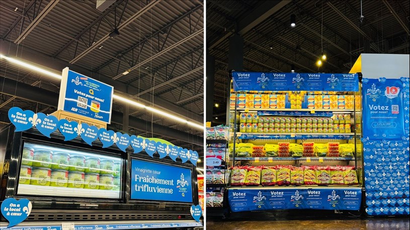 On indique que le commerçant a su se démarquer grâce à une campagne dynamique et bien ancrée dans leur communauté autour de la mayonnaise César, un produit frais et local. L’expérience client a été soigneusement pensée : affichage extérieur et en magasin, étalages thématiques dans les rayons fruits et légumes, coin vedette près des caisses, frigo dédié dans l’allée des vinaigrettes et plusieurs dégustations conjointes avec les équipes des deux entreprises. Chaque point de contact visait à valoriser le caractère trifluvien du produit et à inciter les clients à voter pour leur projet.