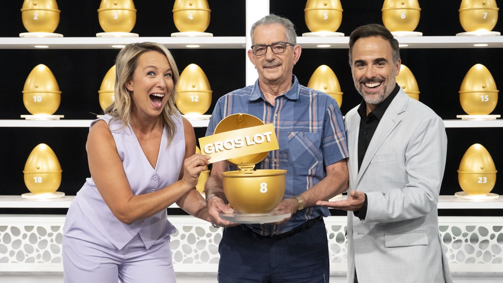 À l’émission, il a opté pour l’œuf numéro 8, chiffre qui correspond à la date de naissance de sa petite-fille. Cet œuf renfermait le gros lot, qui s’élevait à 475 000 $. À ce montant sont venus s’additionner les 12 000 $ que l'heureux gagnant a remportés au jeu des portes, pour un gain total de 487 000 $.